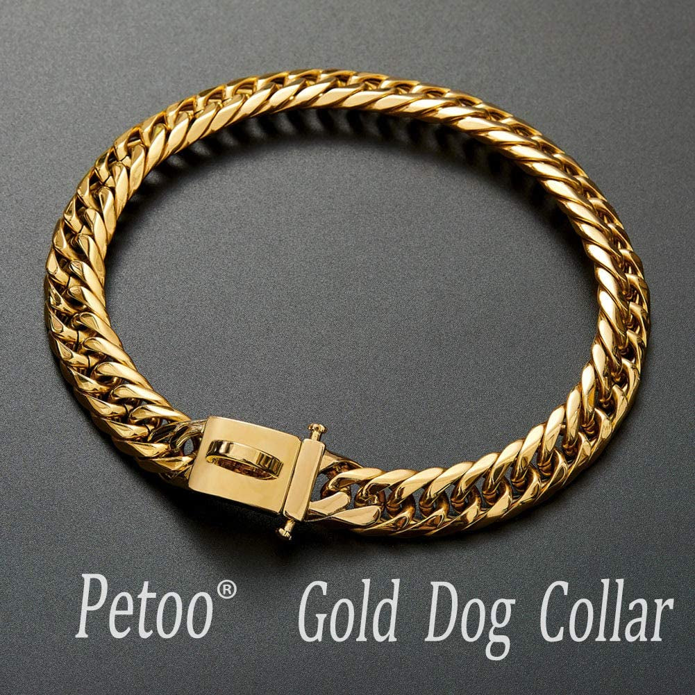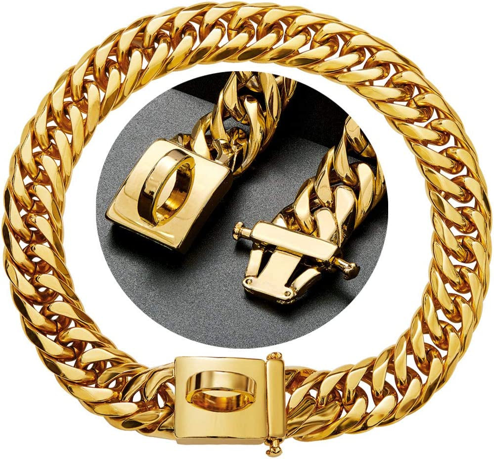 Heavy Duty 18K Gold Dog Big Cuban Collars, Large Medium Small Dogs, 16Mm Wide 16"-26" Thick Stainless Steel Link Necklace, Male Female Bulldog Doberman Dogs